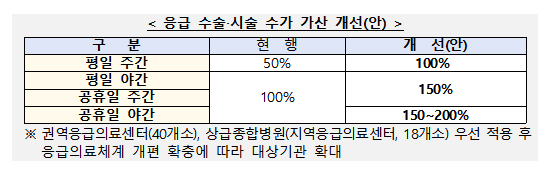 또한 뇌동맥류, 중증외상 등의 야간·휴일 응급 수술·시술에 대해서는 평일 주간과 비교해 보상을 확대하고, 응급실에 내원한 중증 환자를 위한 입원실 확보 및 신속한 후속 진료 연계가 가능하도록 응급전용입원실 관리료가 신설된다.