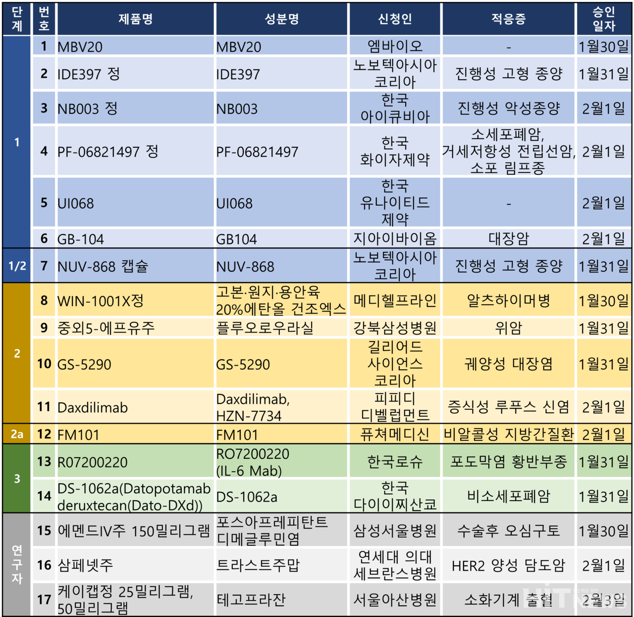 지난주 임상시험계획은 총 17건이 승인 완료됐다. 세부적으로 △1상 6건 △1/2상 1건 △2상 4건 △2a상 1건 △3상 2건 △연구자임상 3건 등이다.