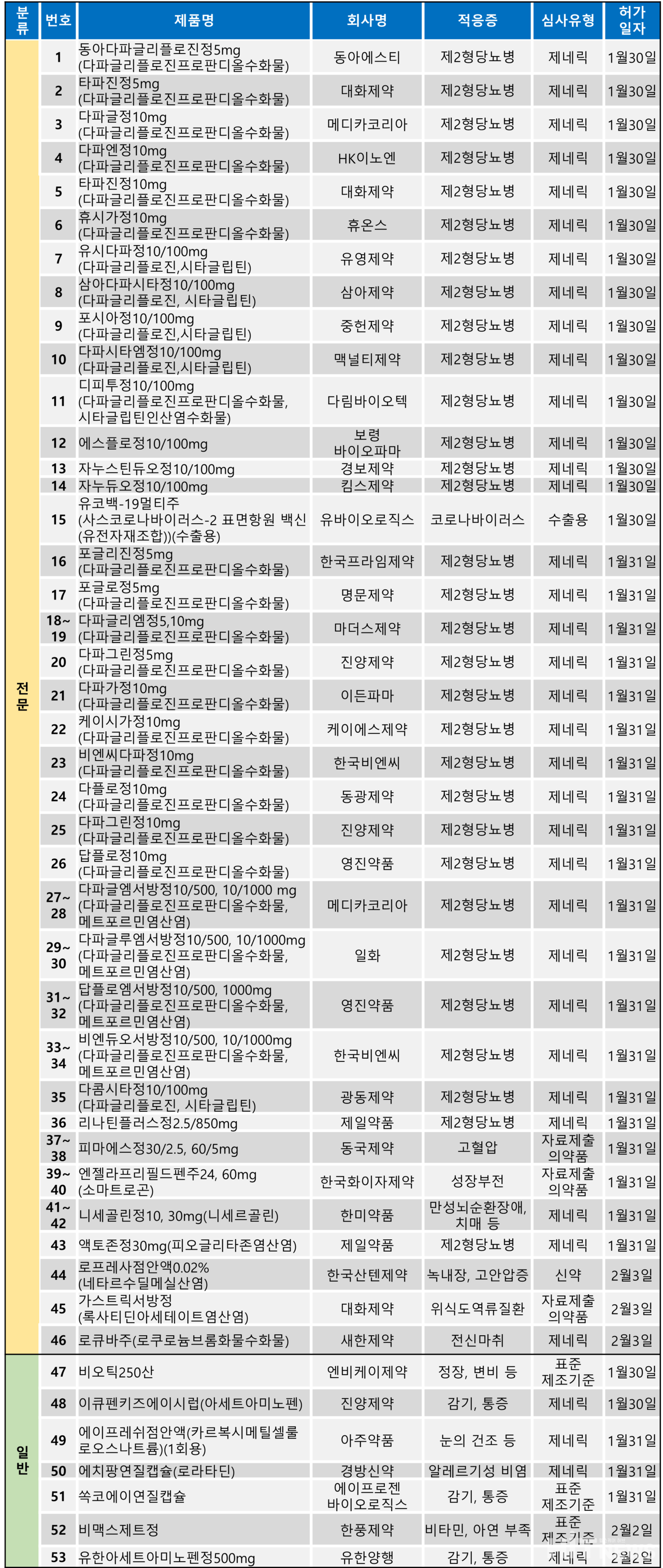 지난 주(1월 30일~2월 3일)에는 총 53개 품목이 식품의약품안전처로부터 품목허가를 받았다. 이 중 전문의약품은 46건, 일반의약품은 7건이었다.