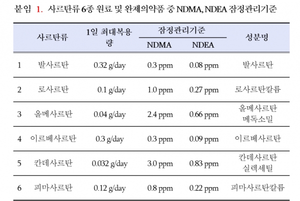 식약처는 발사르탄의 1일 최대 복용량은 0.32g을 기준으로, NDMA는 0.3 ppm, NDEA는 0.08ppm을 기준으로 잡았다.로사르탄은 1일 최대 0.1g 기준 NDMA로 1.0 ppm, NDEA는 0.27 ppm이며 올메사르탄은 0.04g 기준 NDMA 2.4 ppm, NDEA 0.66 ppm 이하로 관리해야 한다.