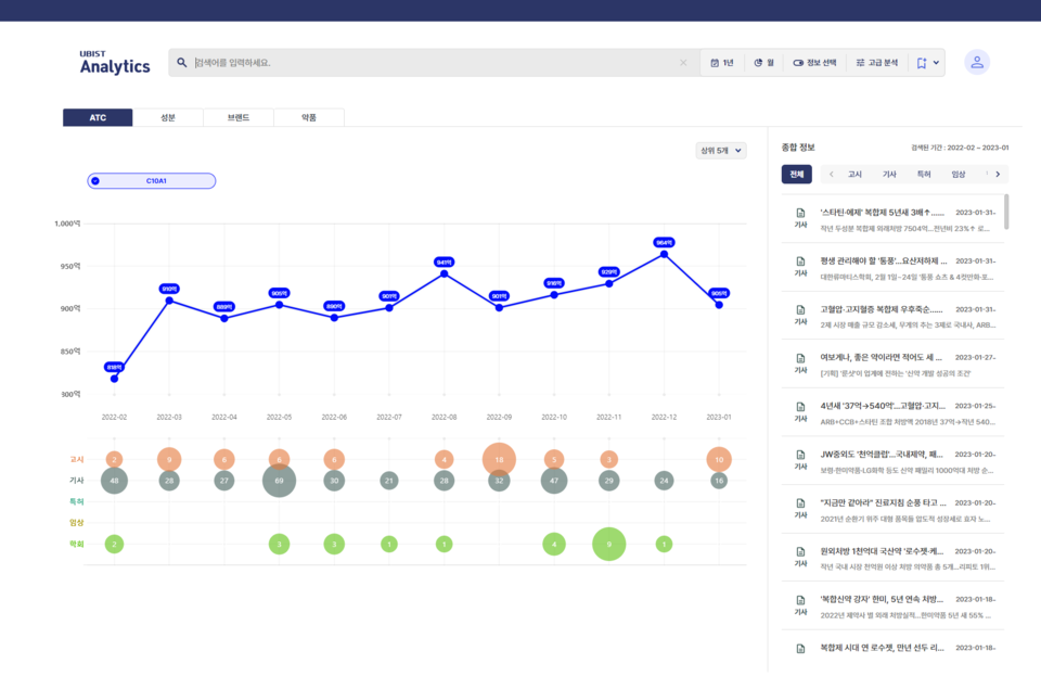 유비케어에 따르면 UBIST Analytics는 원외처방 의약품의 통계 결과값에 대해 심층 데이터 분석을 제공하는 서비스로 이러한 서비스가 국내에 출시된 것은 이번이 처음이다.