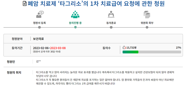 지난 6일 본인을 타그리소를 복용하고 있는 폐암환자라고 소개한 김모씨는 돈과의 싸움이 아닌 치료에 매진할 수 있도록 타그리소 급여를 1차로 확대해 달라는 청원을 게시했다.