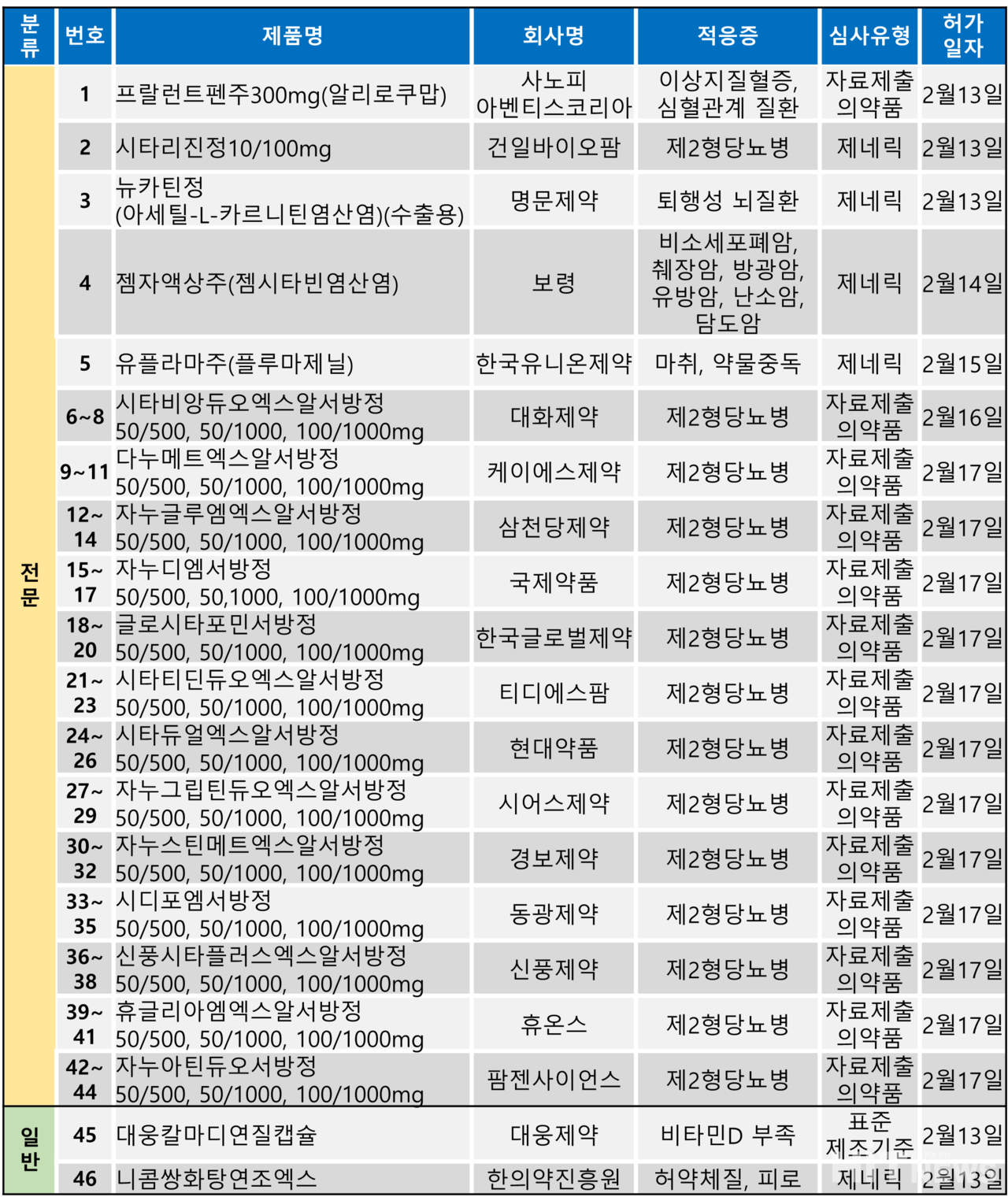 지난 주(2월 13~17일)에는 총 46개 품목이 식품의약품안전처로부터 품목허가를 받았다. 이 중 전문의약품은 44건, 일반의약품은 2건이었다.