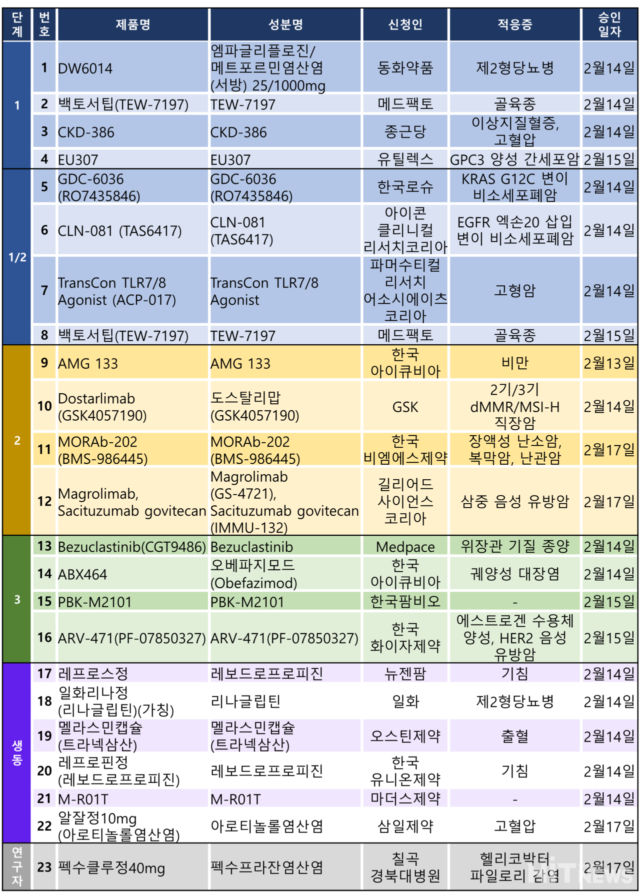 지난주 임상시험계획은 총 23건이 승인 완료됐다. 세부적으로 △1상 4건 △1/2상 4건 △2상 4건 △3상 4건 △생동 6건 △연구자임상 1건 등이다.