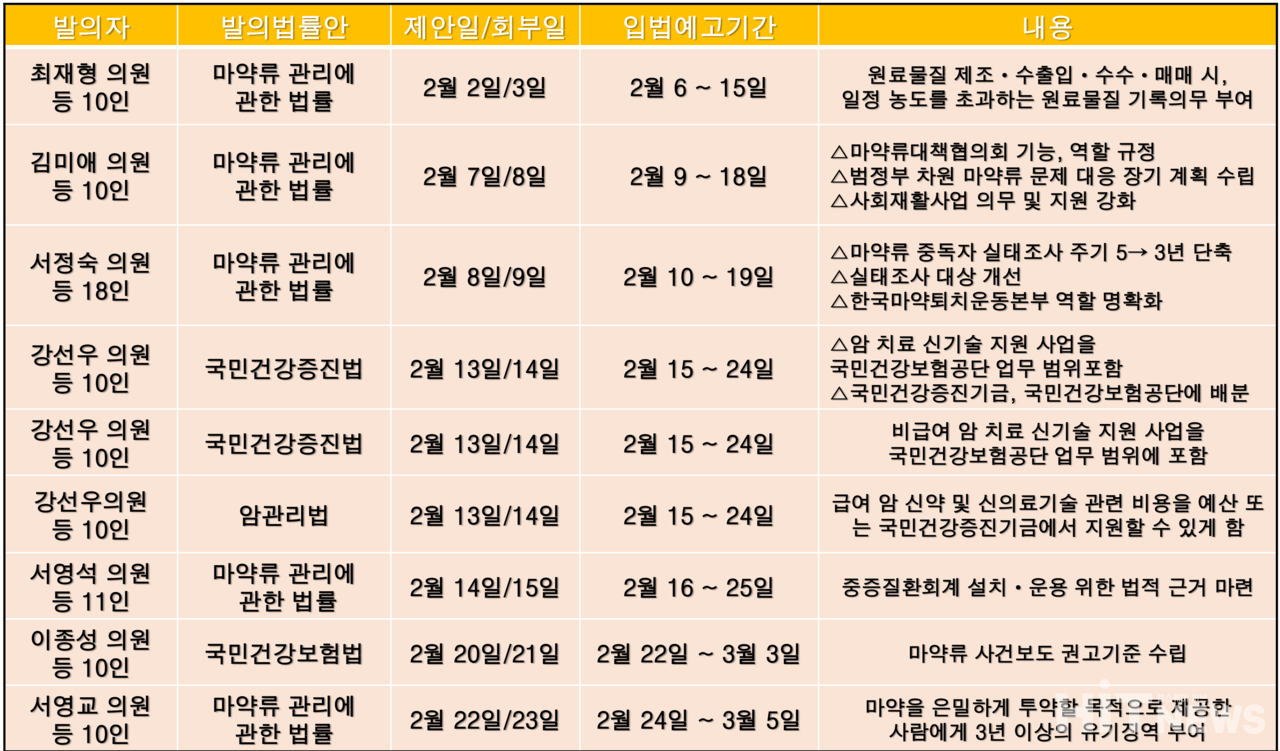 최재형 의원은 '마약류 관리에 관한 법률 일부개정법률안(의안번호 : 19767)'을 발의했다. 지난달 3일 복지위 회부됐으며, 2월 6일부터 15일까지 입법예고 기간을 가졌다.