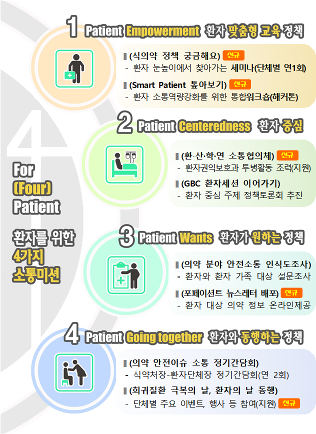 식약처 위해예방정책과 소통협력TF에 따르면, 환자를 위한, 4 Patient 소통 프로젝트는 식약처가 환자 중심의 양방향 소통을 더욱더 적극적으로 이어가기 위해 올해부터 추진하는 프로젝트다.