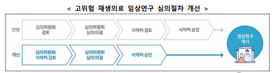 복지부는 희귀·난치질환자를 비롯한 보편적인 치료 기회 확대 및 기술 발전을 뒷받침하기 위해 단기적으로 고위험 임상연구 심의절차를 개선해 심의기간을 단축하는 한편, 중장기적으로 (가칭)재생의료시술 도입과 임상연구 대상 질환 확대 등을 검토할 예정이다.