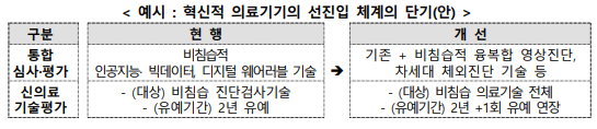 이에 복지부는 단기적으로 혁신의료기기 통합심사·평가제도와 신의료기술평가 유예제도 적용 대상의 확대를, 중·장기적으로는 한시적 비급여로 우선(先) 사용하고(1~3년), 건강보험 등재 단계에서 의료기술평가를 시행하는 방안을 검토한다.