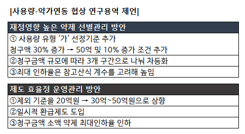 반면, 제도의 효율적인 운영을 위해 △제외기준을 기존 20억에서 30억~50억으로 상향하고 △일시적 환급제도를 도입하며 △청구금액 소액 약제의 최대인하율을 낮추는 방안을 내놨다.