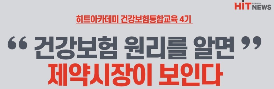 히트아카데미 건강보험통합교육은 바이오헬스 전문 뉴스 플랫폼 히트뉴스가 운영하는 교육 강좌 중 하나로 '건강보험 원리를 알면 제약시장이 보인다'를 주제로 오는 4월 4일부터 7주간 매주 화요일 진행된다.