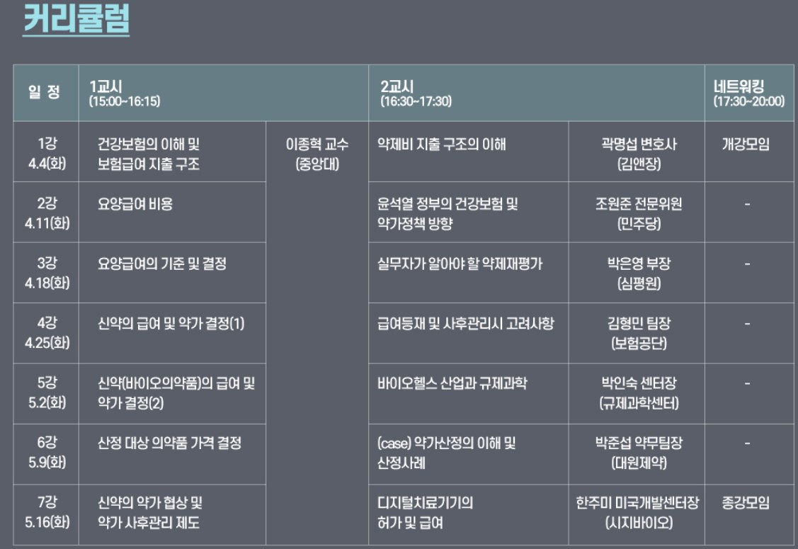 강사진 및 강의내용을 살펴보면, △곽명섭 김앤장 변호사(전 보건복지부 보험약제과장, 약제비 지출 구조의 이해) △조원준 더불어민주당 석전문위원(윤석열 정부의 건강보험 및 약가정책 방향) △박은영 건강보험심사평가원 약제평가부장(실무자가 알아야 할 약제재평가) △김형민 국민건강보험공단 사용량관리부 팀장(급여등재 및 사후관리 시 고려사항) △박인숙 한국규제과학센터 센터장(전 식품의약품안전평가 바이오생약심사부장, 바이오헬스 산업과 규제과학) △박준섭 대원제약 약무팀장(Case : 약가산정의 이해 및 산정사례) △한주미 시지바이오 미국개발센터장(전 대웅제약 임상개발센터장, 디지털치료기기의 허가 및 급여) 등으로 구성된다.