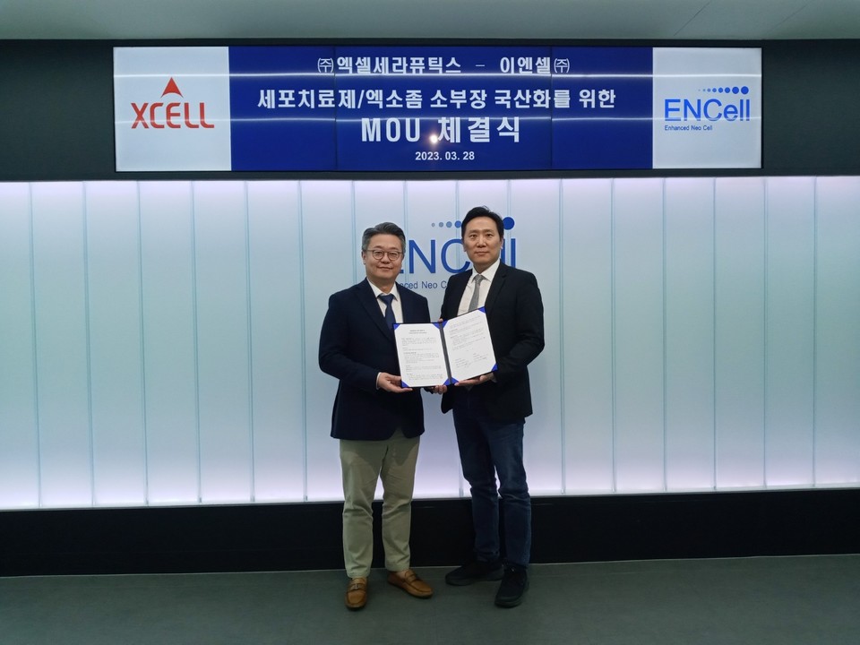 엑셀세라퓨틱스(대표 이의일)는 이엔셀(대표 장종욱)과 세포치료제 생산공정 구축사업을 위한 전략적 파트너십 업무협약(MOU)을 맺었다고 28일 밝혔다.