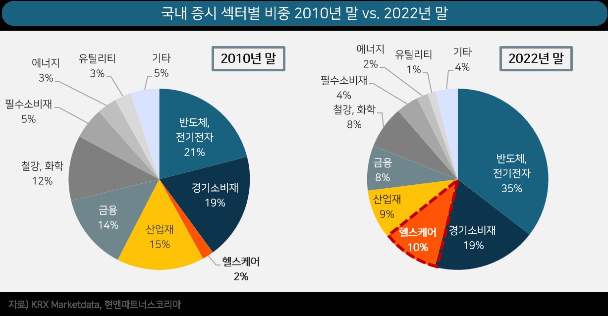 지난 2010년 말 기준, 국내 증시를 구성하는 업종 중 헬스케어의 비중은 2% 남짓이었다. 이때는 2008년 금융위기 극복과 함께 베이징올림픽을 시작으로 중국경제 팽창 효과를 누린 한국이 수혜를 받던 시기다. 그 결과 삼성전자, SK하이닉스는 물론 현대기아차, LG전자, 식음료, 유통 등을 포함한 반도체&전기전자, 경기소비재가 대호황을 누리면서, 전체 증시의 40% 이상을 차지했다. 하지만 지난 2022년 말 기준 헬스케어 비중은 10%를 넘어섰다. 기존 반도체 및 경기소비재의 비중은 더욱 커졌고, 그 사이 산업재, 금융, 철강화학, 필수소비재 업종을 제치고 헬스케어 업종이 국내 3대 대표 업종으로 부상한 것이다.