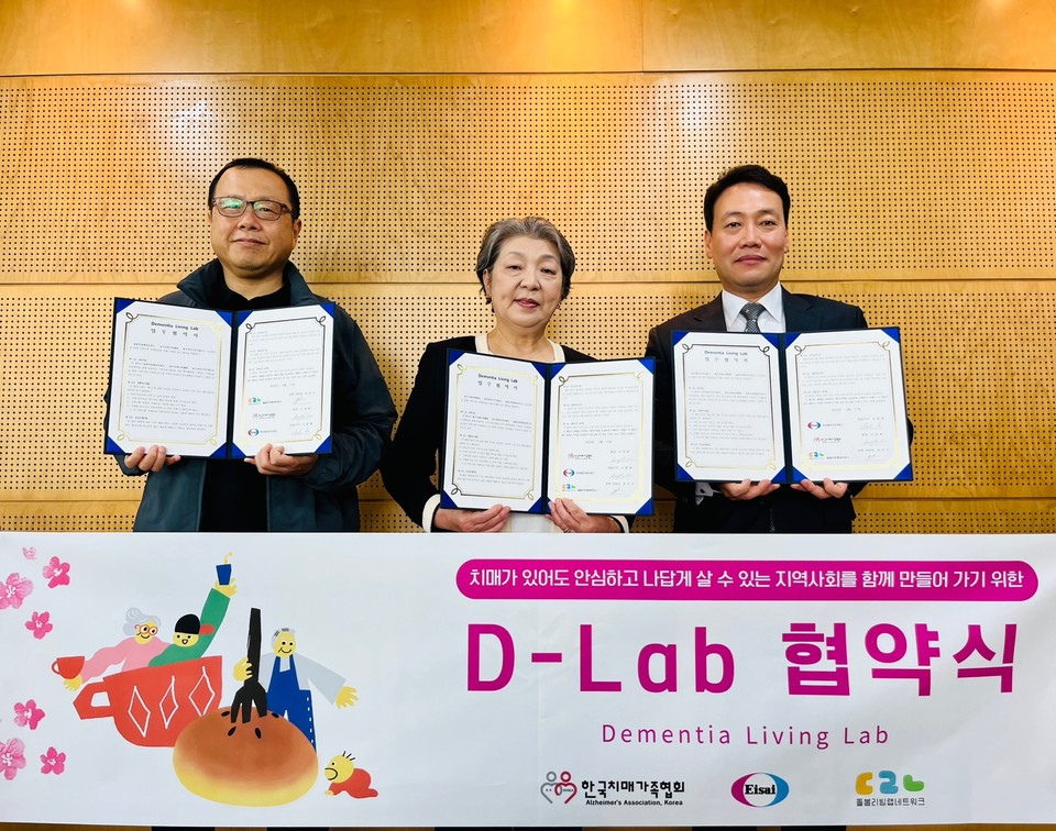 치매가 있어도 안심하고 최대치의 삶을 살 수 있는 지역사회를 만들기 위해 한국치매가족협회, 한국에자이, 돌봄리빙랩네트워크가 'Dementia Living Lab'협약을 체결했다.