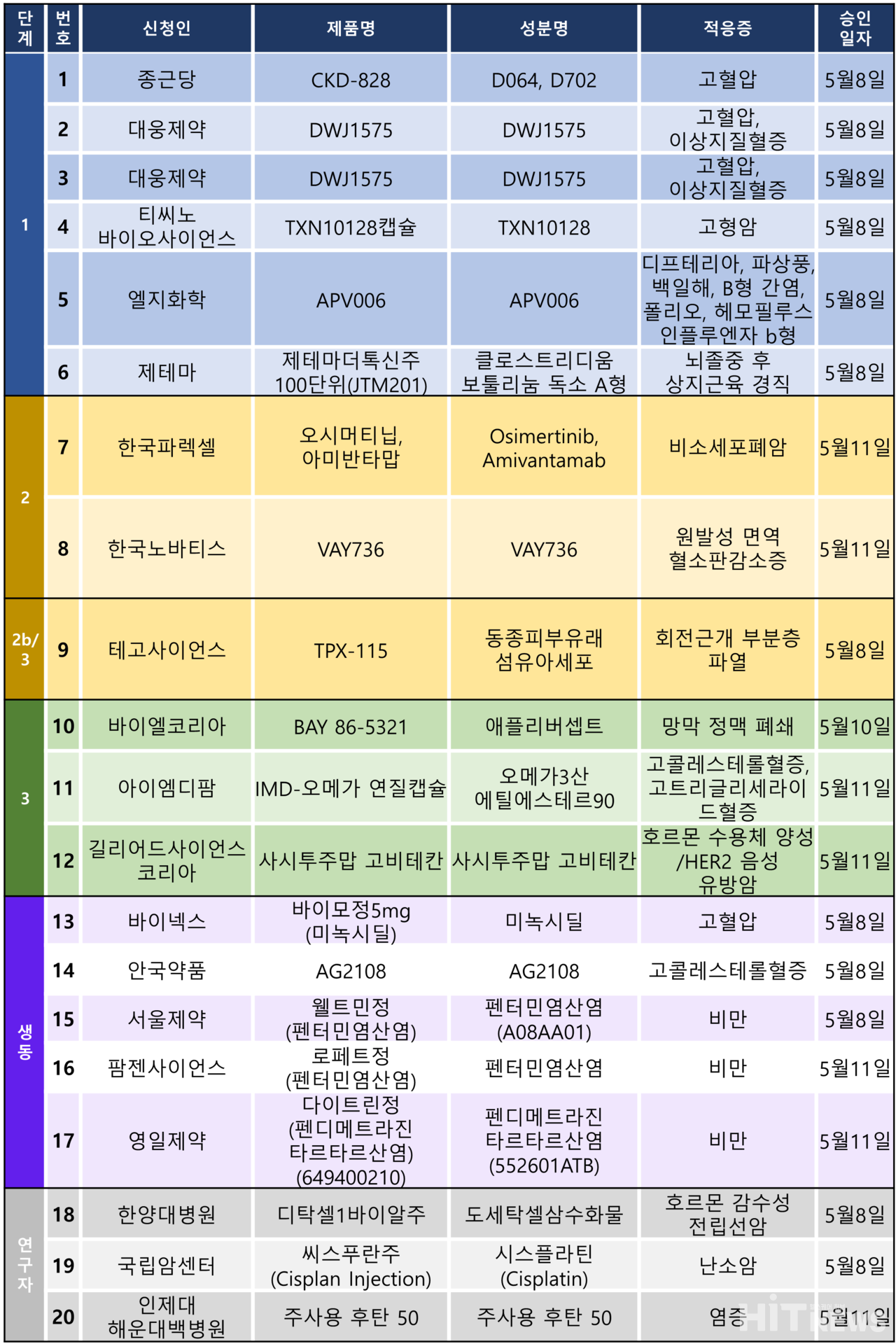 임상시험계획은 총 20건이 승인됐다. 세부적으로 △임상 1상 6건 △임상 2상 2건 △임상 2b/3상 1건 △임상 3상 3건 △생물학적동등성 5건 △연구자임상 3건 등이다. 이 임상시험들은 고혈압, 이상지질혈증, 원발성 면역 혈소판 감소증, 망막 정맥 폐쇄 등 다양한 질환과 고형암, 비소세포폐암, 유방암, 난소암 등 암종을 대상으로 승인됐다.
