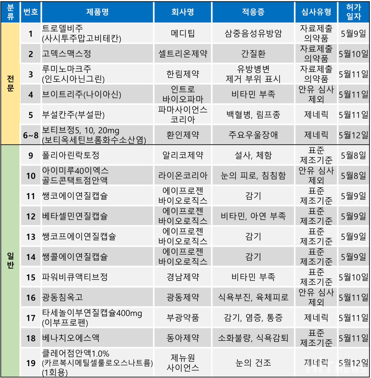 지난주(5월 8~12일) 총 19개 품목이 식품의약품안전처로부터 품목허가를 받았다. 전문의약품은 8개 품목, 일반의약품은 11개 품목이었다. 허가 품목들은 삼중음성유방암, 간질환, 백혈병, 주요우울장애 등 다양한 적응증으로 허가됐다.