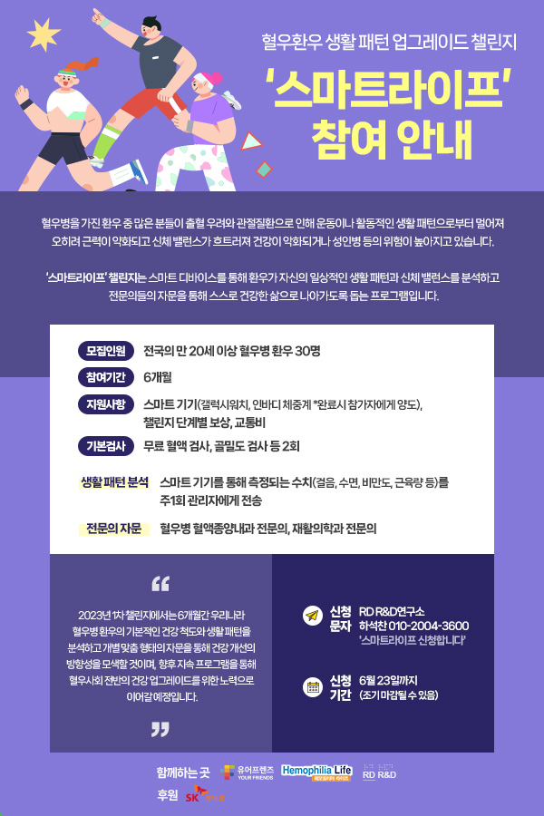 올해 처음으로 진행하는 스마트라이프 챌린지는 환우들의 데이터를 분석, 건강생활을 도모하고 유효한 결과는 세계혈우연맹(World Foundation of HemophiliaㆍWFH) 학술대회에서 발표할 예정이다. 이후 대상자 및 규모를 확대해 혈우사회 전반으로 프로그램을 확대하게 된다.