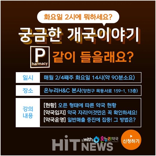 온누리H&C가 '궁금한 개국이야기 P(Pharmacy)'라는 주제로 최근 약국 트렌드와 신규 약국 자리 잡는 노하우 등을 다루는 창업설명회를 오는 13일 본사에서 진행한다.