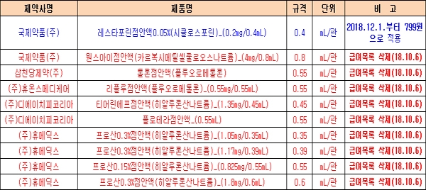 국제약품 원스아이점안액 0.8ml, 삼천당제약 톨론점안액0.55ml, 휴온스메디케어의 리플루점안액0.55ml, 디에이치피코리아의 티어린에프점안액0.45ml와 플로테라점안액 0.55ml, 휴메딕스의 프로산0.3% 점안액 0.35·0.39·0.6ml와 프로산0.15%점안액0.55ml 등은 2년간 청구실적 등이 없어서 10월6일부터 급여목록에서 삭제됐다. 따라서 이번 약가 재환원에 영향을 받지 않는다.