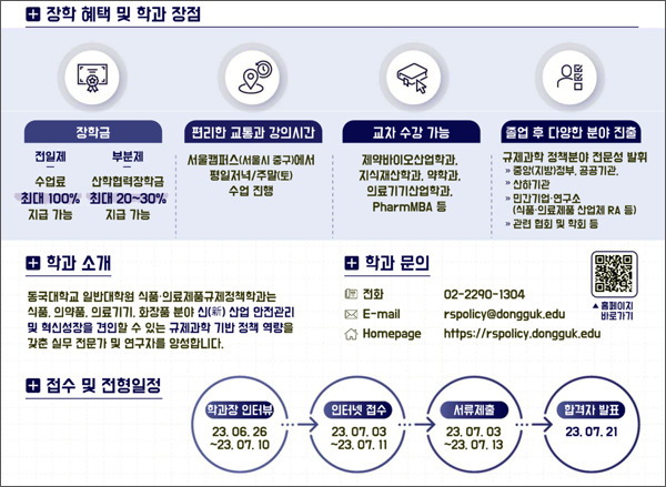 동국대 식품·의료제품규제정책학과(학과장 및 연구책임자 권경희 교수ㆍ이하 규제정책학과)가 26일부터 2023년 2학기 특별전형 신입생 모집에 나선다. 규제정책학과 신입생은 석사, 박사 및 석·박사통합과정으로 지원할 수 있으며, 신진연구자(전일제)와 현장전문가(부분제)를 모두 모집할 예정이다.