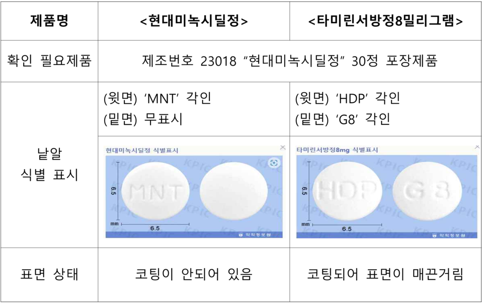 식약처 측은 "23018 제조번호를 가진 현대미녹시딜정 제품을 조제하거나, 복용 시 '타미린서방정8밀리그램'으로 의심되는 경우에는 즉시 투약 및 복용을 중단하고, 구입 약국 또는 현대약품에 반품을 진행해 주시기 바란다"며 "다행히 제제간 혼입 포장은 없는 것으로 확인된다"고 전했다.
