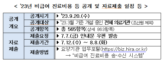 건강보험심사평가원(원장 강중구)은 국민의 알 권리를 보장하고 합리적 의료선택을 지원하기 위해 2023년 비급여 진료비용 공개를 위한 자료제출 및 공개 일정을 안내했다.
