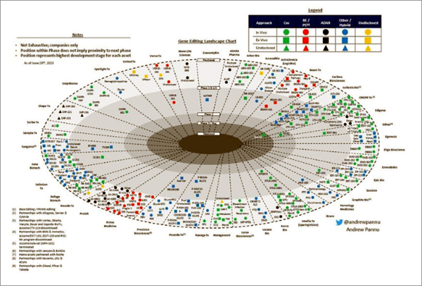 유전자가위로 치료제를 개발하는 전 세계 42개 기업 및 연구소가 진행중인 전임상/임상 시험이 250개가 넘는다. 이들 파이프라인들을 하나로 정리한 그래프를 최근 페북(facebook)에서 보았다. 물론 이중 85%는 초기 단계 전임상 진행중이지만 이 기술에 대한 개발 경쟁의 뜨거움을 요즈음 여름 날씨처럼 뜨겁다[그림 1].