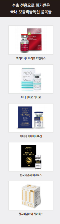 2020년부터 2022년까지 국내 허가를 받은 11개 품목 가운데 휴메딕스 비비톡신을 제외하고 △파마리서치바이오의 리엔톡스 △제테마의 제테마더톡신 △프로톡스의 프로톡신 △한국비엔씨의 비에녹스 △이니바이오의 이니보 △메디카코리아의 톡스나인 △한국비엠아이의 하이톡스 △대웅바이오의 에이톡신 △종근당바이오의 타임버스 △제네톡스의 보타원 등은 모두 수출용이다.