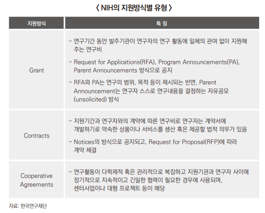 코로나19 시기 모더나와 함께 백신 개발에 핵심적 역할을 담당하면서 더 잘 알려진 NIH는 20여개 산하 연구소와 센터가 각각 독립적인 예산을 확보해 R&D를 진행한다. 흥미롭게 볼 대목은 외부 연구 지원 정책. 이들은 지원은 하되 발주기관의 연구활동에는 관여하지 않는 이른바 '그랜트(grant) 방식'의 지원이 90% 이상을 차지한다. 특히 그랜트 방식 내 Parent Announcements 형태의 지원은 연구자가 스스로 연구내용까지 결정할 수 있도록 하고 있다. 해당 방식은 전체 연구비 지원의 절반 이상을 차지한다.