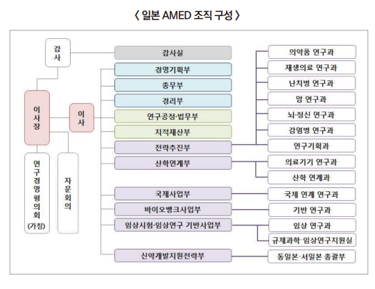 또다른 사례는 일본의 '일본의료연구개발기구(Japan Agency for Medical Research and Developement, AMED)'다. 일본 정부는 2015년 AMED 신설 전에 해당 기구를 하나의 독립 행정법인 형태로 구성하기로 하고 2014년에는 이들의 권한과 업무, 조직 구성 등을 법률화한 '건강·의료 전략 추진 법안'과 '독립행정법인 일본의료연구개발기구 법안'을 먼저 신설했다. 컨트롤타워의 입지를 명확히 해야 거버넌스의 통합 관리가 가능하다는 이유에서였다.