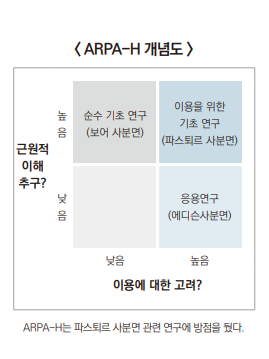 전통적인 연구나 상업적 활동으로는 쉽게 달성할 수 없는 획기적인 기술과 광범위하게 적용되는 플랫폼을 연구하는 ARPA-H는 NIH 산하로 기존 인프라, 네트워크를 활용할 수 있으며, 보건복지부 장관이 직접 관여하는 형태로 독립적 운영을 시작했다. 여기에 최고 인재를 4~5년 임기제 PM(Project Manager)으로 영입해 자율성을 보장하고 강력한 기획·평가 권한을 부여하는 제도를 도입했다.