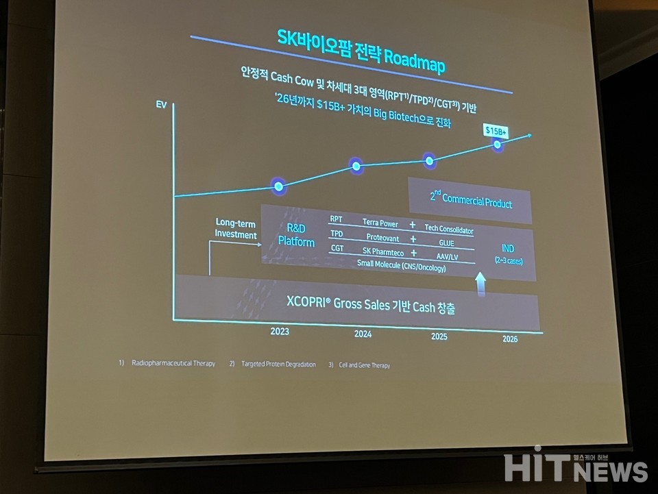 "SK바이오팜은 기존 자산(Asset)에 플랫폼 기술을 더하고, SK그룹과의 시너지 창출에 나서겠습니다. 안정적 현금창출력과 3가지 신규 모달리티(Modality) 분야에 진출하겠습니다. 이를 통해 2026년까지 150억달러(약 19조원)의 기업가치를 지닌 균형 잡힌 '빅 바이오텍(Big Biotech)'으로 도약하겠습니다."