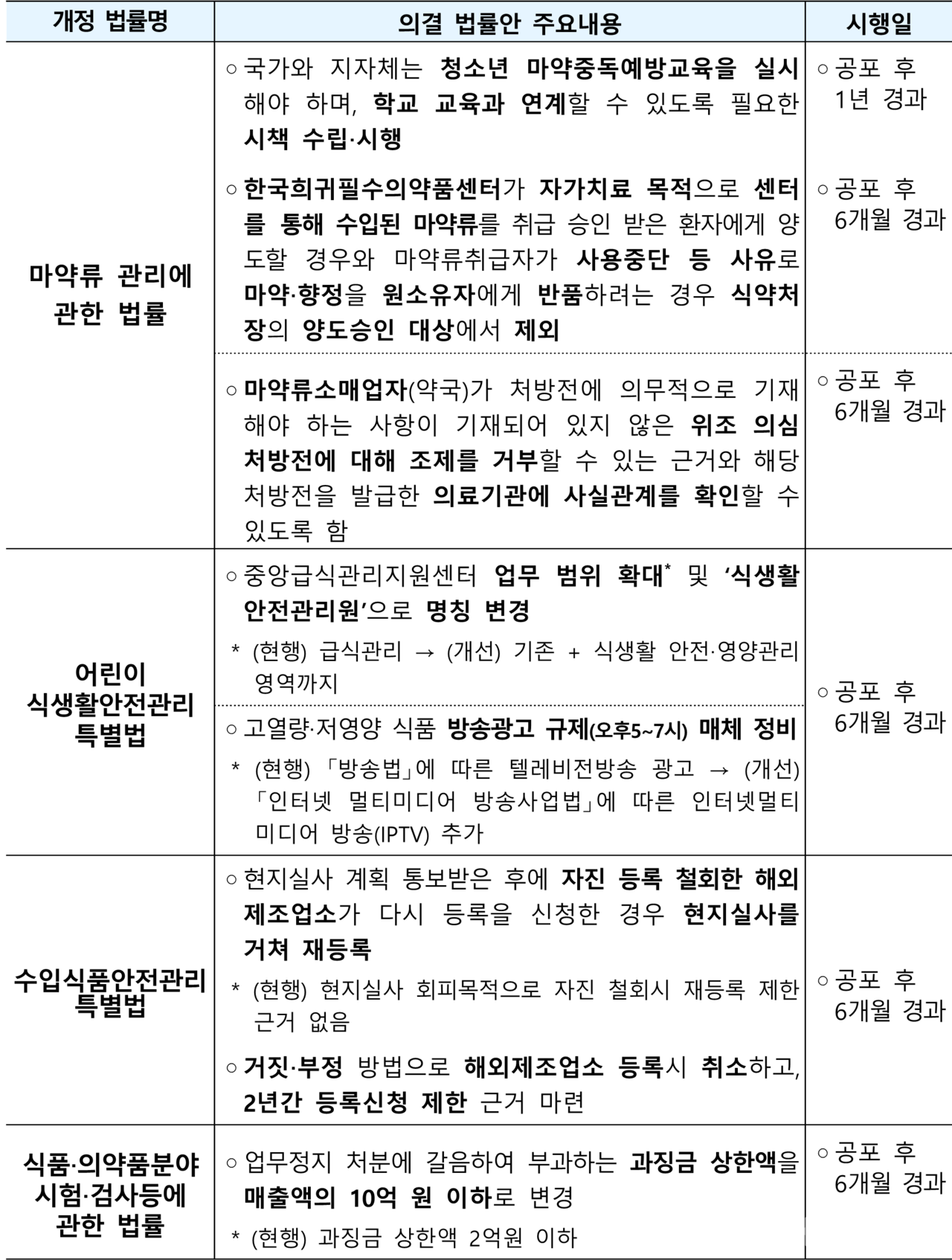 청소년 마약류 중독 예방 교육의 국가 책임 명문화 등 내용을 담은 식품의약품안전처 소관 4개 법률 개정안이 국회 본회의를 통과했다. 식약처(처장 오유경)는 '마약류 관리에 관한 법률', '어린이 식생활안전관리 특별법' 등 총 4개 법률 개정안이 18일 국회 본회의를 통과했다고 밝혔다.