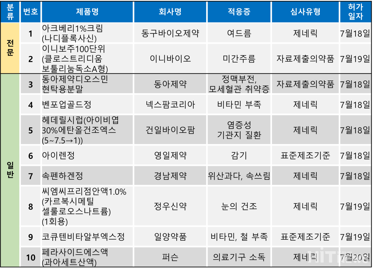 지난주(7월 17~21일) 총 10개 품목이 식품의약품안전처로부터 품목 허가를 받았다. 전문의약품은 2개 품목, 일반의약품은 8개 품목이었다. 허가 품목들은 미간주름, 여드름, 염증성 기관지 질환, 위산과다 등 다양한 적응증으로 허가됐다.