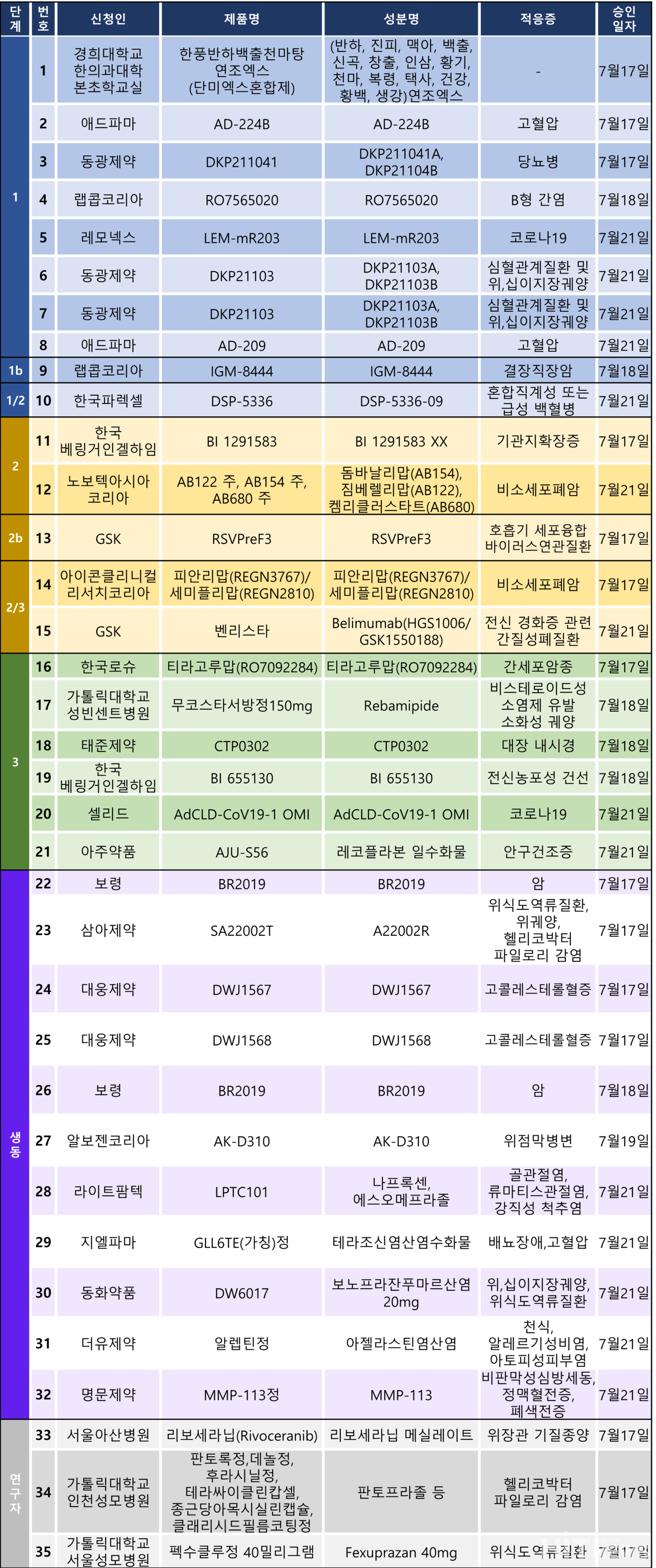 임상시험계획은 총 35건이 승인됐다. 세부적으로 △1상 8건 △1b상 1건 △1/2상 1건 △2상 2건 △2b상 1건 △2/3상 2건 △3상 6건 △생물학적동등성 11건 △연구자 임상 3건 등이다. 이 임상시험들은 고혈압, 당뇨병, 고콜레스테롤혈증, 만성 B형 간염, 코로나19 바이러스 감염, 전신 농포성 건선, 안구건조증 등 질환과 비소세포폐암, 결장직장암, 간세포암 등 암종을 대상으로 승인됐다.