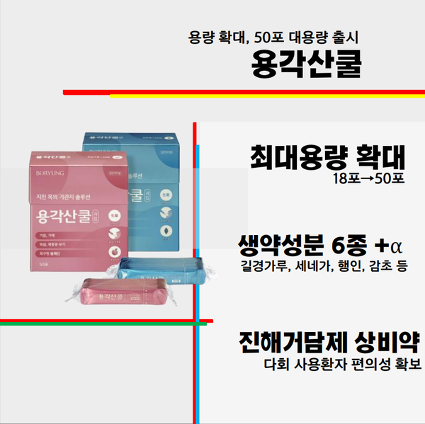 코로나19 오미크론 변이를 기점으로 진해거담제 부문 상비약으로 분류되면서 점유율을 올린 보령컨슈머헬스케어의 진해거담제 '용각산쿨'이 50포 대용량으로 새롭게 출시됩니다.
