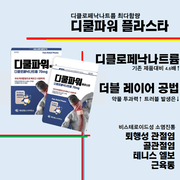 회사에 따르면 디쿨파워 플라스타는 파스 주성분인 디클로페낙나트륨 함량을 기존 제품 대비 4.6배 높인 70mg을 함유하고 있습니다. 퇴행성 관절염, 골관절염, 테니스 엘보, 근육통 등에 효과적인 제품입니다. 디클로페낙나트륨은 비스테로이드성 소염진통제(NSAIDs) 성분으로 24시간 효과가 지속되며 통증 완화 효과에 도움을 줍니다.