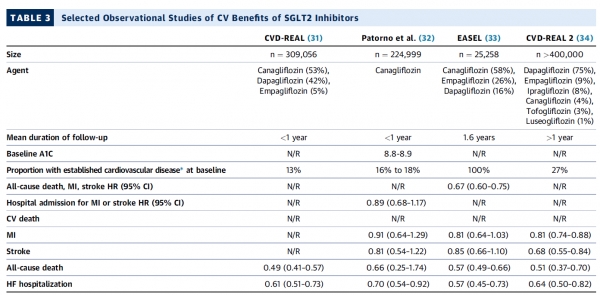 SGLT-2 억제제를 이용한 대규모 임상으로는 CVD-REAL, Patorno et al, EASEL, CVD-REAL 2 임상이 있다. 이 임상결과를 종합적으로 살펴보면, 심혈관계 사망은 입증되지 못 했고, 심부전으로 인한 입원률만이 통계적으로 유의미한 결과가 나왔다.