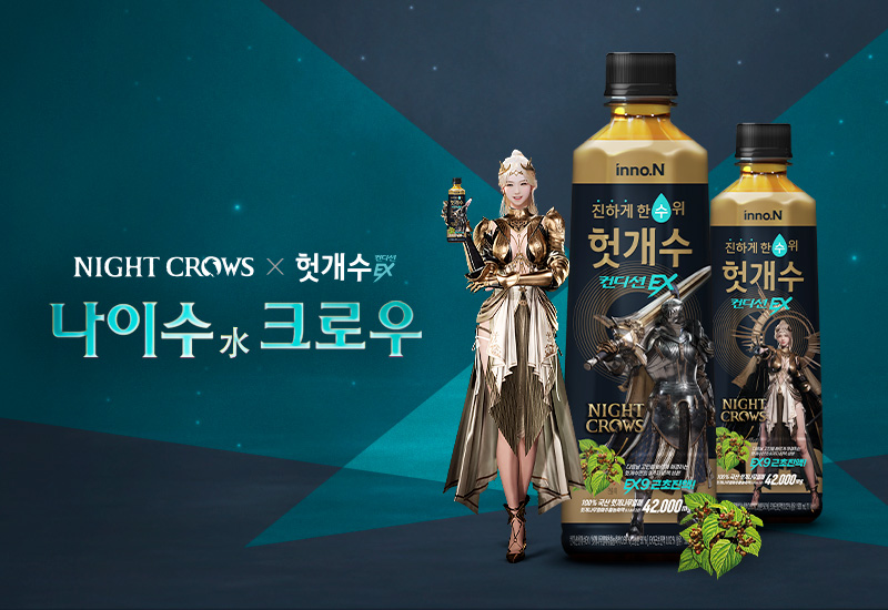 전국 편의점 및 '뉴틴몰'에서 '헛개수EX 나이트 크로우 에디션' 구매 시 게임 아이템 쿠폰 '나이수(水) 크로우 선물상자'를 받을 수 있다.