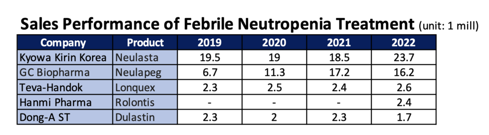 Reflecting on market dynamics over the past year, changes have manifested through distributor transitions and the introduction of novel drugs. IQVIA data provides insights into the performance of key neutropenia treatment drugs up until the previous year. Notably, 'Neulasta' achieved sales of $23.7 million (31.4 billion won). A partnership between Kyowa Kirin and Boryung Pharmaceuticals facilitated joint distribution of 'Neulapeg,' resulting in sales growth from $18.5 million (24.5 billion won) in 2021 to $23.7 million (31.4 billion won) in 2022, exemplifying the partnership's efficacy.