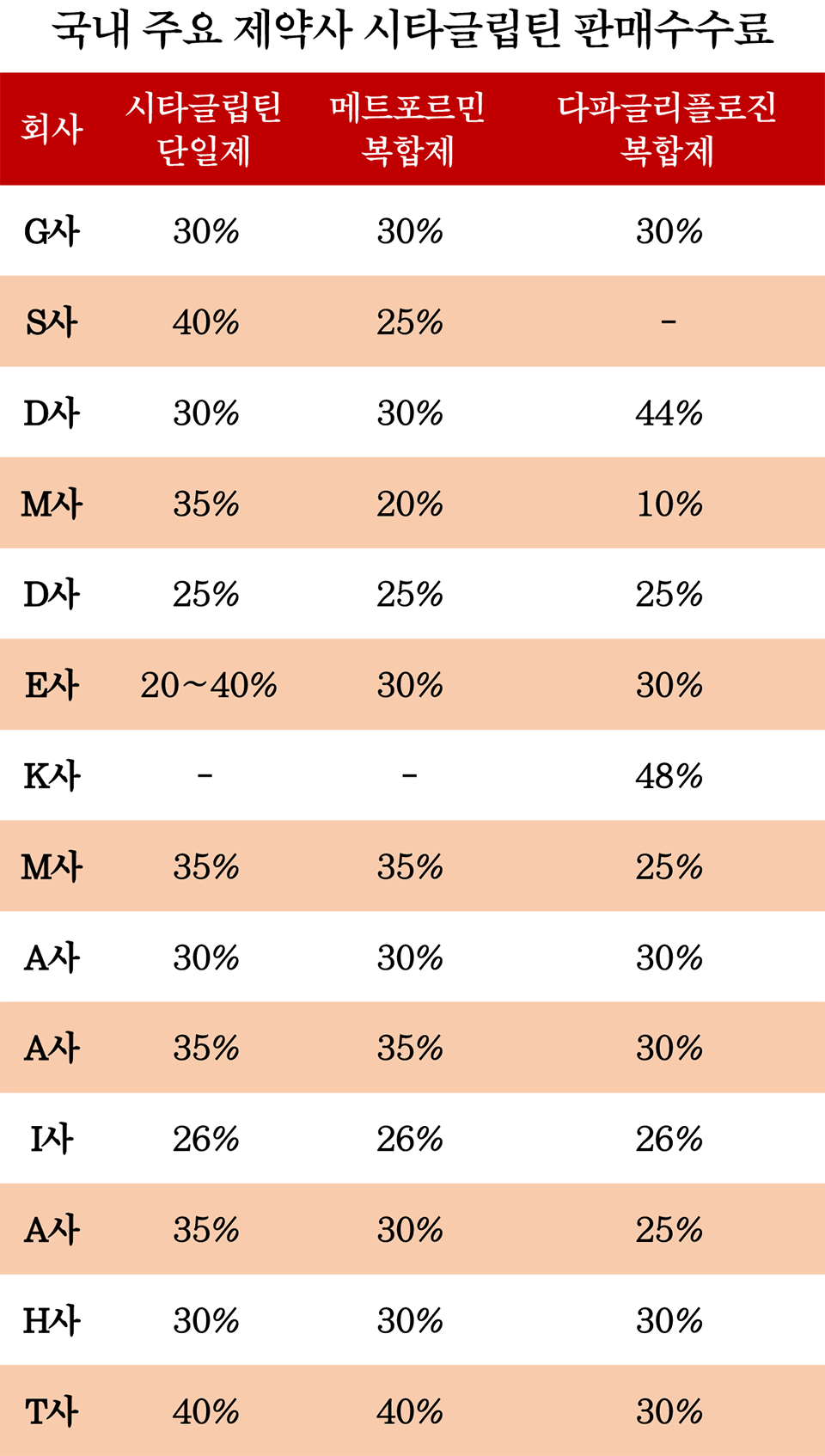 먼저 이들 단일제의 평균 수준은 약 30%대였다. 국내 E사와 I사는 20%대까지 내려갔으며 나머지는 30~40%를 기록했다. 메트포르민 복합제의 경우도 이와 비슷했다. 다파글리플로진의 경우는 조금 극단화를 보였다. 많은 곳은 50%에 가까운 수수료를 내놓은 K사 등이 있는 반면 M사 등은 10%까지 줄어들었다. 특히 일반적인 추이를 보면 단일제 대비 복합제의 수수료가 다소 줄어드는 경향도 보였다.