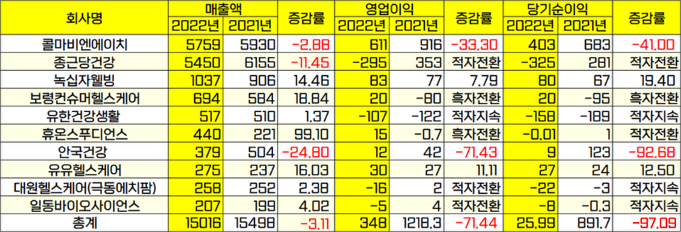 누구나 모두가 할 것 없이 뛰어드는 건강기능식품 시장에서 업체들이 포화상태 속 영업실적에서 지난해 대비 다소 떨어진 실적을 받아들었습니다. 히트뉴스가 국내 제약사 건기식 자회사 10개의 2022년도 영업실적을 조사해보니 2022년도 전체 매출은 1조5016억원으로 전년(1조5498억원) 대비 3.11% 감소했는데 매출액에 비해 영업이익과 당기순이익은 각각 71.44%, 97.09% 큰 폭으로 줄어들었습니다.
