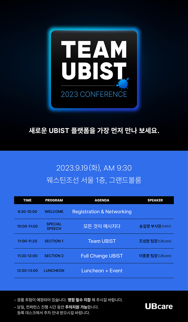 유비케어(대표 이상경)는 오는 19일 웨스틴조선 서울에서 '팀 유비스트(TEAM UBIST)' 컨퍼런스를 개최한다고 4일 밝혔다.