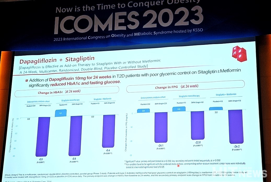 데이터를 살펴보면, 24주 시점에서 다파글리플로진 병용요법 환자군은 기저치 대비 당화혈색소 0.5% 감소, 공복 혈중 포도당 수치 24.1㎎/dl 감소, 체중은 2.1㎏ 감소, 수축기 혈압 6㎜Hg 감소(8주 기준) 등 효과가 나타났다.
