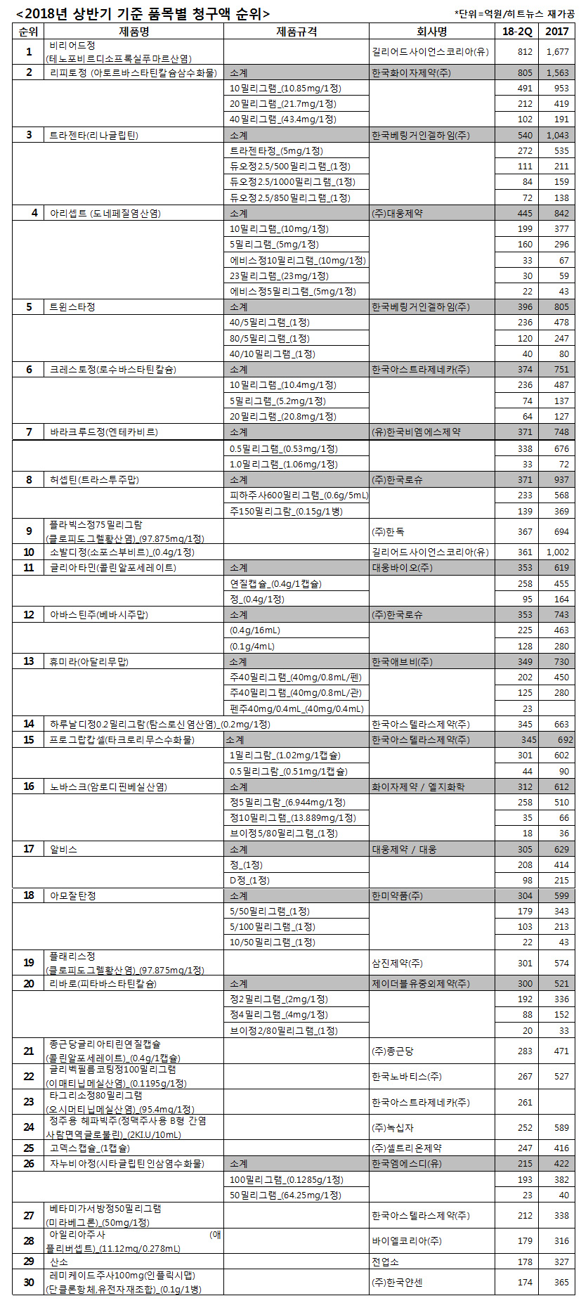 히트뉴스가 2018년 상반기 품목별 보험청구액을 분석한 결과 비리어드가 812억으로 1위를 유지했으나 2위인 리피토가 805억을 기록하면서 1-2위간 청구액 격차가 7억 차이로 좁혀졌다.