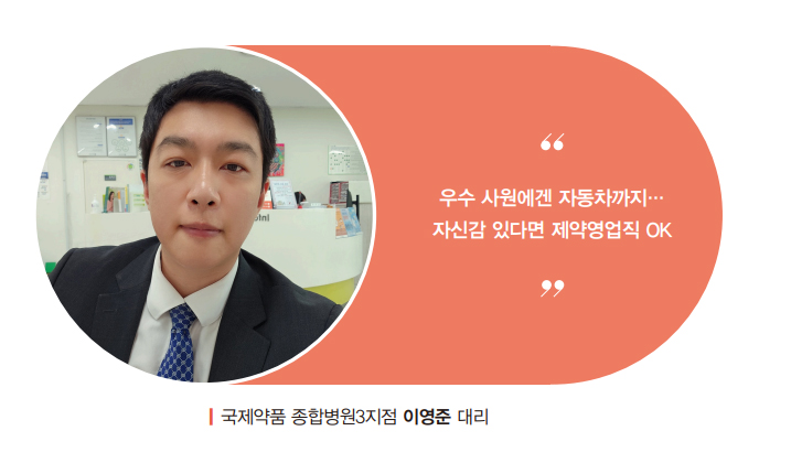 "안녕하세요? 국제약품 종합병원3지점 이영준 대리입니다. 저는 2018년 국제약품 서울종병2지점에 입사하여 현재는 종병3지점에서 영업활동을 하고 있습니다. 저는 병원을 방문해 자사 제품에 대한 디테일을 통해 처방을 이끌어 냅니다. 또 종합병원에서 환자들이 의사를 통하여 저희 전문약을 문제없이 처방받을 수 있도록 하는 업무를 수행합니다."