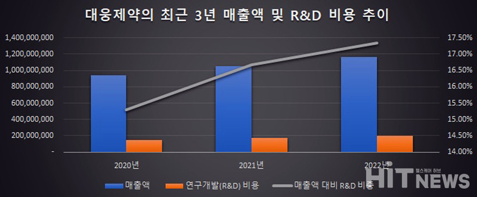 누구라도 갖고 싶어하는 자체품목 혹은 자기품목은 연구개발의 성과인데 근래 3년 대웅제약의 매출액대비연구개발비율과 금액은 ①2022년 17.34% 2014억원 ②2021년 16.67% 1759억원 ③2020년 15.30% 1445억원에 이른다. 그러면서도 같은 기간 영업이익률과 금액은 9.1% 1060억원, 9.1% 955억원, 1.3% 126억원이었다. 자기 제품 효과를 누리며 2021년 1조551억원으로 전통 제약산업계가 꿈꿔왔던 매출 1조원을 돌파했다. R&D가 돈이 되고, 모아진 돈이 R&D를 추동하는 선순환 구도가 탄탄해 지고 있다.