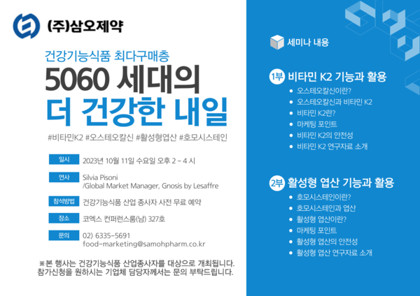 이와 관련해 삼오제약은 오는 11일 서울 삼성동 코엑스(컨퍼런스룸 327호)에서 비타민 K₂ 기능 및 연구자료 등을 소개하는 '비타민 K₂ㆍ활성형 엽산 기능과 활용' 세미나를 개최하는 등 채비에 나서고 있다.