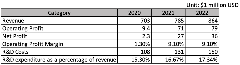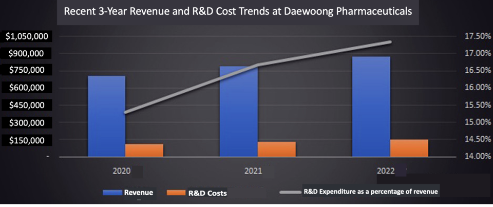 Daewoong Pharmaceuticals has maintained a robust research and development (R&D) investment ratio and amount compared to total revenue. In 2022, R&D investment reached 17.34% at $150 million. In 2021, it was 16.67% at $131 million, and in 2020, it reached 15.30% at $107 million. This investment translated into financial success, with the company achieving $1.2 billion in revenue in 2021.