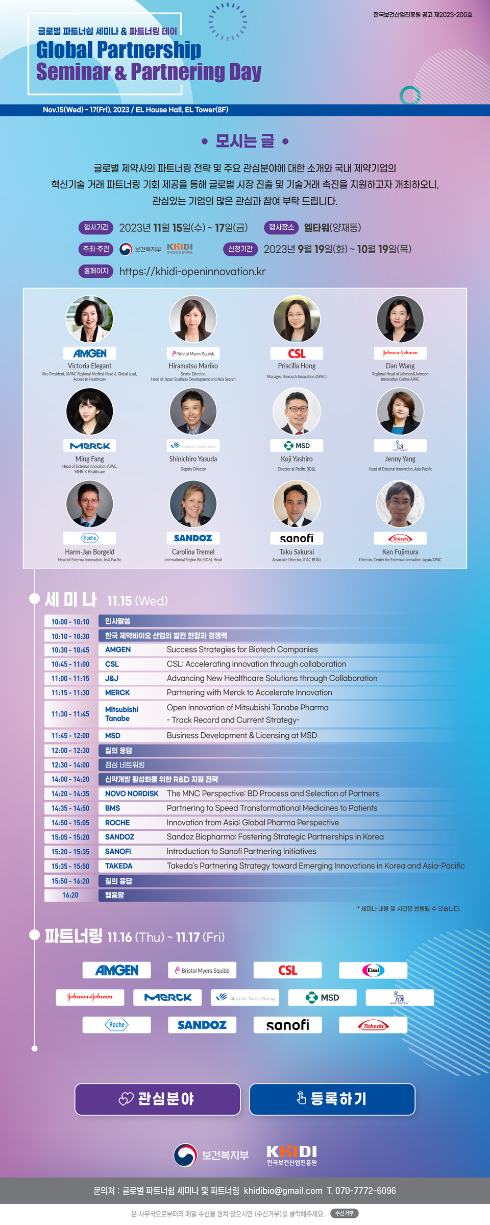 세부적으로 행사 일정을 살펴보면 11월 15일에는 세미나, 11월 16일부터 17일까지 이틀 간은 비즈니스 파트너링으로 구성된다. 15일 세미나에서는 각 글로벌 제약사의 주요 관심 사업 분야 및 기술 동향, 한국과의 협업 전략, 오픈 이노베이션 성공 사례 등을 발표할 예정이다.